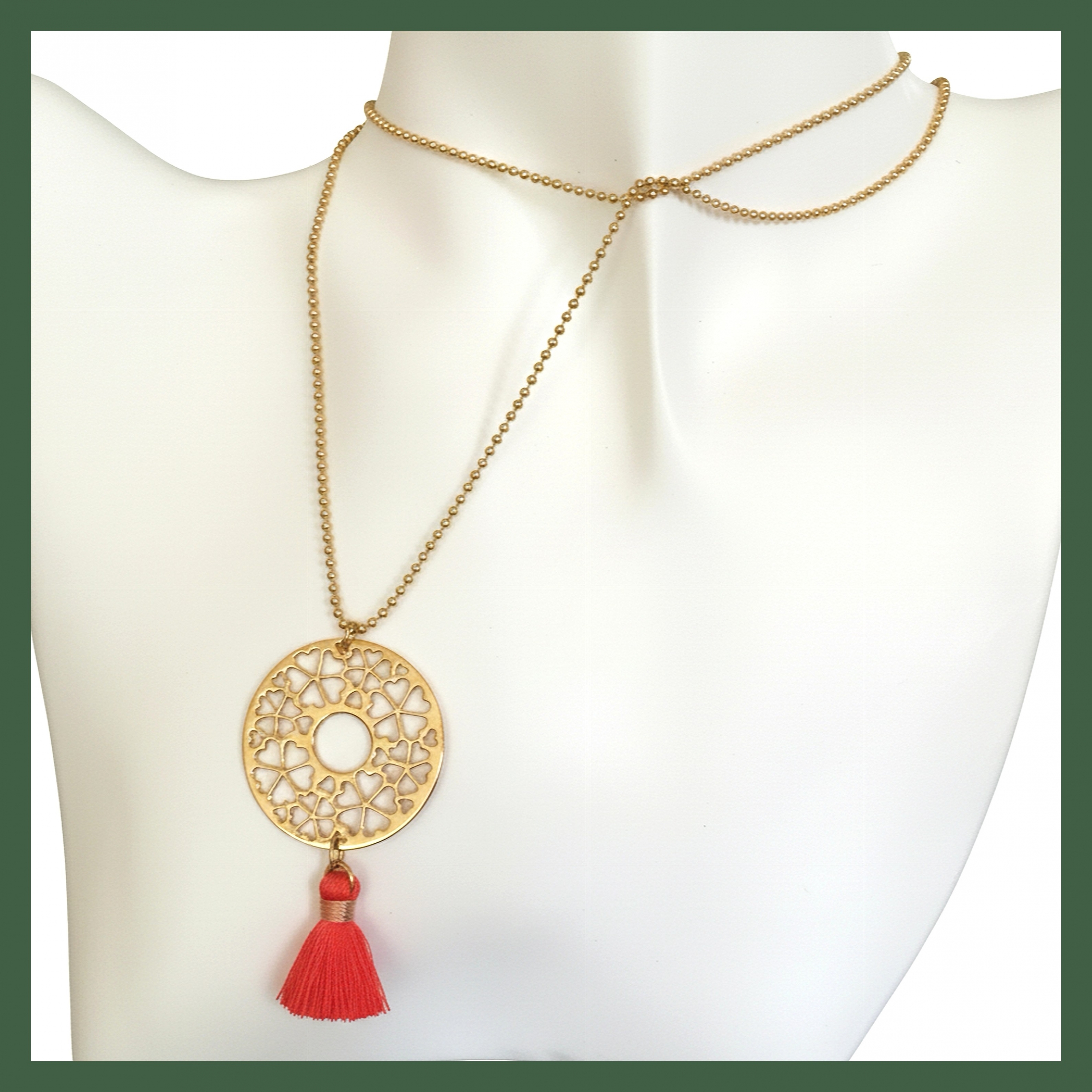 Sautoir arabesque pompon corail plaqué or