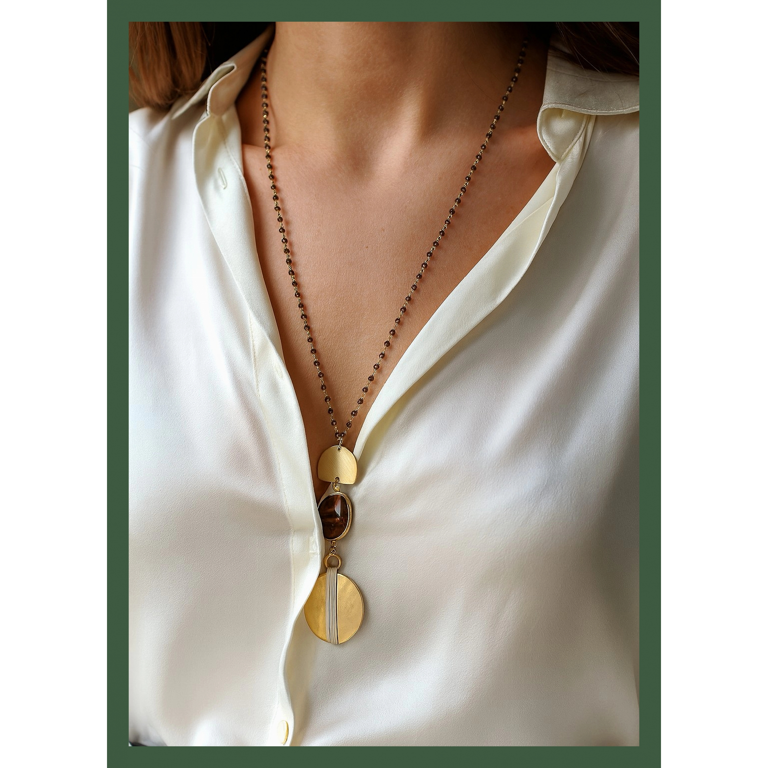 Sautoir chaîne perlée marron et pendentifs géométriques dorés